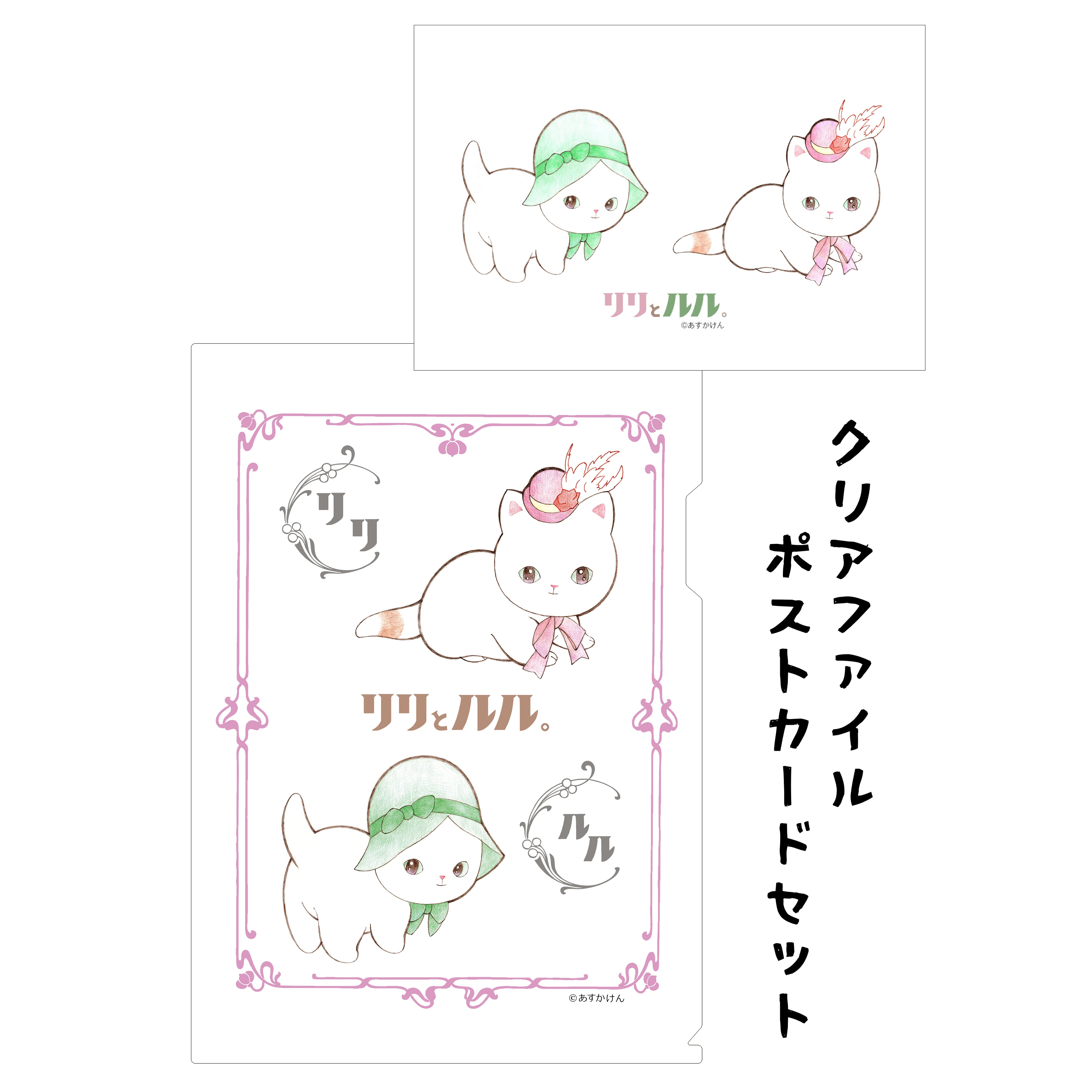 猫の姉妹、リリとルルの愛らしいイラストが施されたクリアファイルとポストカードのセットです。